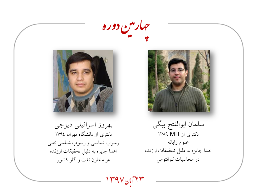 - از ۱۳۹۶/۰۹/۲۷ تا ۱۳۹۷/۰۶/۱۹ تشکیل هشت جلسهی هیئت اجرایی و چندین جلسهی کار گروهها بهمنظور تعیین سه کاندید در هر شاخهی علمی