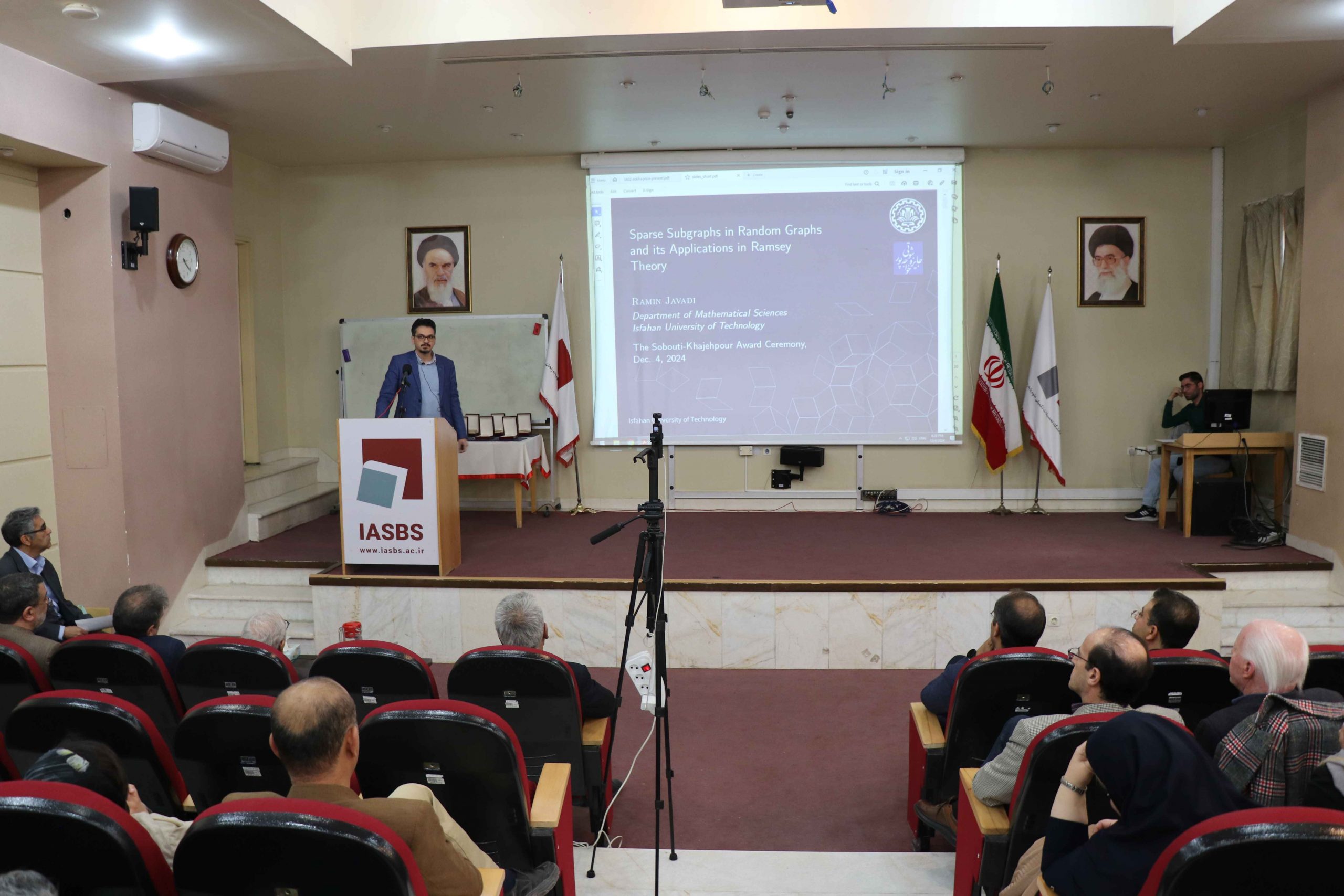 مراسم اهدای جوایز هفتمین و هشتمین دوره جایزه ثبوتی – خواجهپور روز ۱۴ آذر ۱۴۰۳ در دانشگاه تحصیلات تکمیلی علومپایه برگزار شد. برندگان هفتمین دوره (سال ۱۴۰۱) دکتر هادی پرستار در شیمی، دکتر هاجر زمانی در علوم زیستی و دکتر امیرمهدی حسینی منزه در علوم کامپیوتر هستند. برندگان هشتمین دوره (سال ۱۴۰۲) نیز دکتر صدیقه سجادیان در فیزیک، دکتر میثم عابدی در علوم زمین و دکتر رامین جوادی در ریاضی هستند. ابتدا دکتر فرهاد ثبوتی رئیس هیئت اجرایی جایزه گزارشی درباره روند بررسی رزومه پژوهشی کاندیداها و انتخاب برندگان ارائه کرد. سپس ریاست دانشگاه آقای دکتر نصیری قیداری و استادان یوسف ثبوتی و محمدرضا خواجهپور سخنانی کوتاه ایراد فرمودند. پس از آن هر یک از برندگان شرح مختصری از فعالیتهای پژوهشی خود به حضار ارائه کردند. در پایان جوایز اهدا شده و از برندگان تقدیر به عمل آمد.